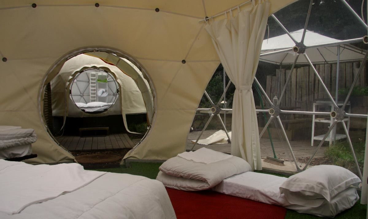 The larger exo-dome has an external stainless-steel frame and a lightweight inner shell. Inside, there’s room to spread out, play cards, read, or sleep up to four. Across the way, the bed-dome keeps things snug: a triple bed set low in the floor and a large roof panel made for stargazing. Couples tend to claim the sky. Families tend to claim the laughter—either works.